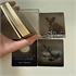 This STS Deluxe edition is an atmospheric Lenormand deck with gold gilded cards depicting the traditional 36 Lenormand symbols. Included are additional cards in black & White with colored back. They are the Man, the Woman, the Child, the House, the Tower, the Book, the Dog, the Fish, the Ring, the Heart, the Ship, the Letter, and the Dog. Those bonus cards can be used to add extra people or topics into the deck when needed.